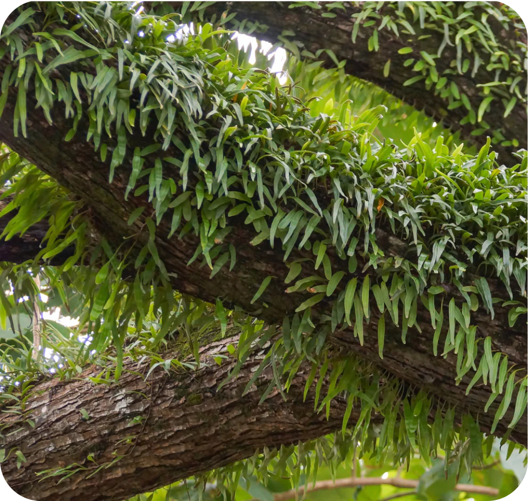 The same fern species thriving on both a tree branch and the tevaplanter vessel