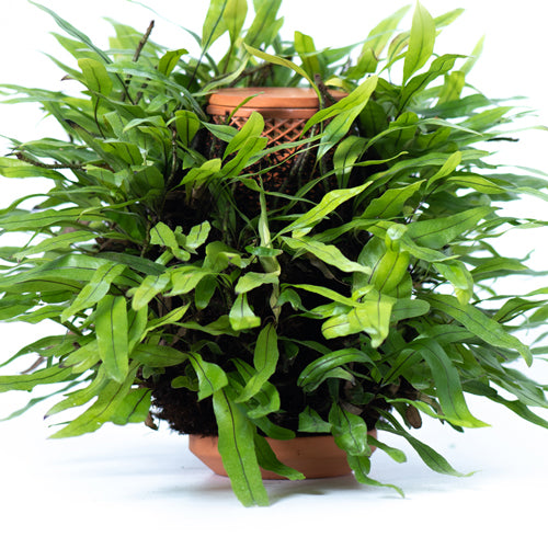 The Bird's Nest Fern, native to tropical regions, thrives on trees in rainforests. Indoors, its leaves reach up to 2 feet, shorter than the 5 feet possible outdoors. Start with a small plug on the tevaplanter, Bird's nest ferns thrive in bright, indirect light. It prefers consistent moisture, so mount it on the lower-mid section and maintain a high water level. It adapts well to the tevaplanter, making it an excellent choice for enthusiasts.