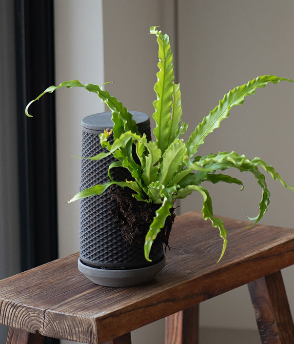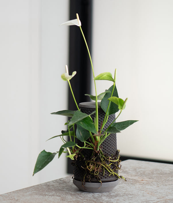 The tevaplanter is a soil-free planter made from porous ceramic. Its reservoir slowly releases water through the walls, allowing roots to grow on the outside surface. This creates a clean, natural, and visually striking way to display plants.